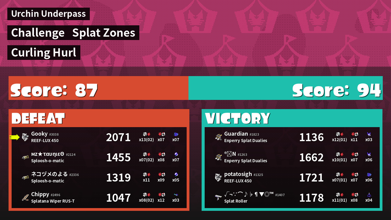 | Medals | #1 Overall Splatter #1 Turf Inker #1 Enemy Splatter | ||