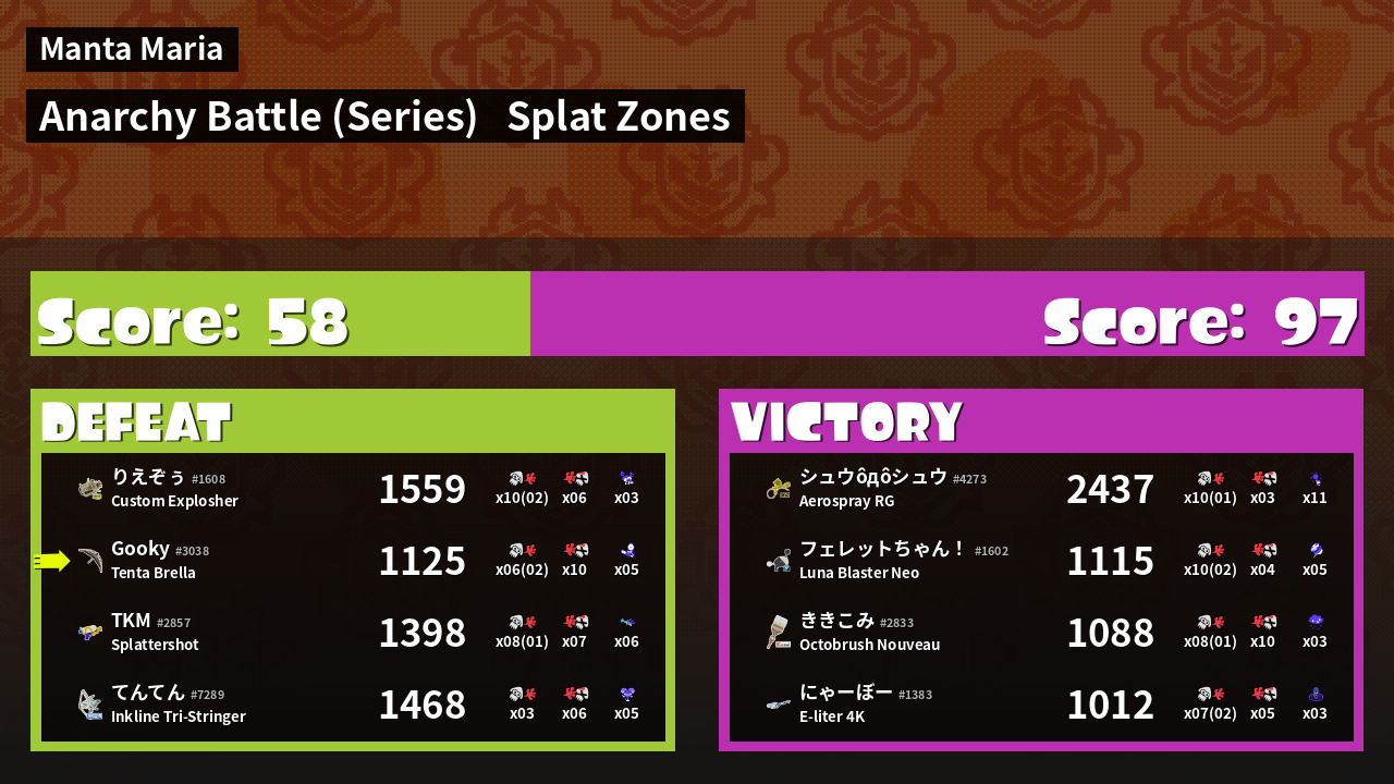 | Medals | #1 Splat Zone Guard #1 Super Jump Spot #1 Splat Assister | ||