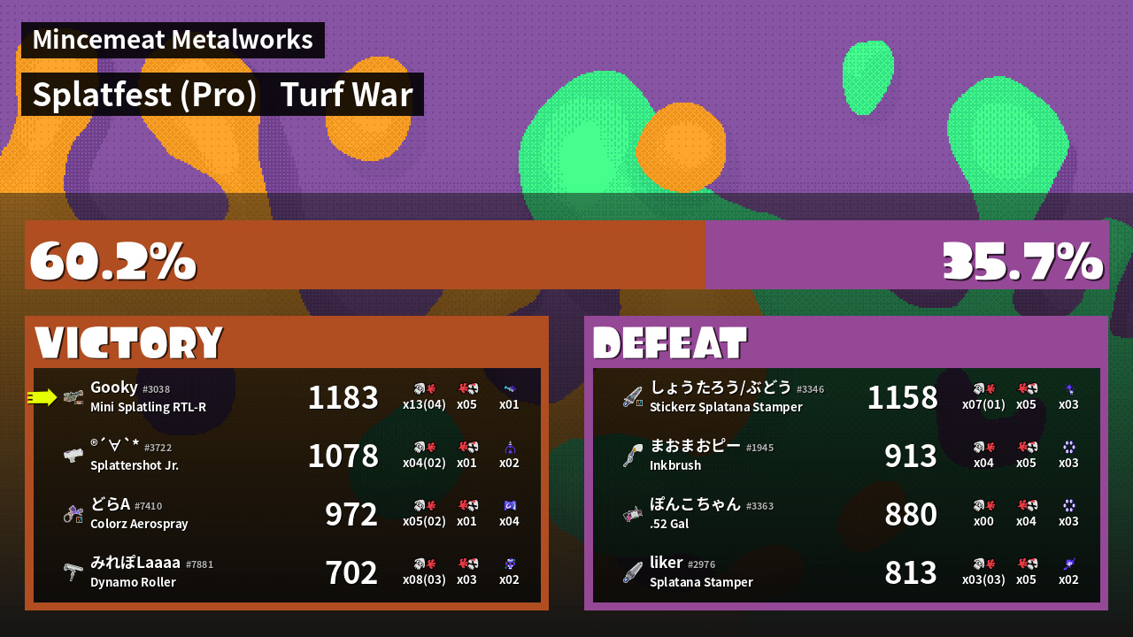 | Vindictive Jokester  しょうたろう/ぶどう #3346 |  Stickerz Splatana Stamper                    | 1,158 | 6 + 1 | 5 | 1.20 |  3 | |
