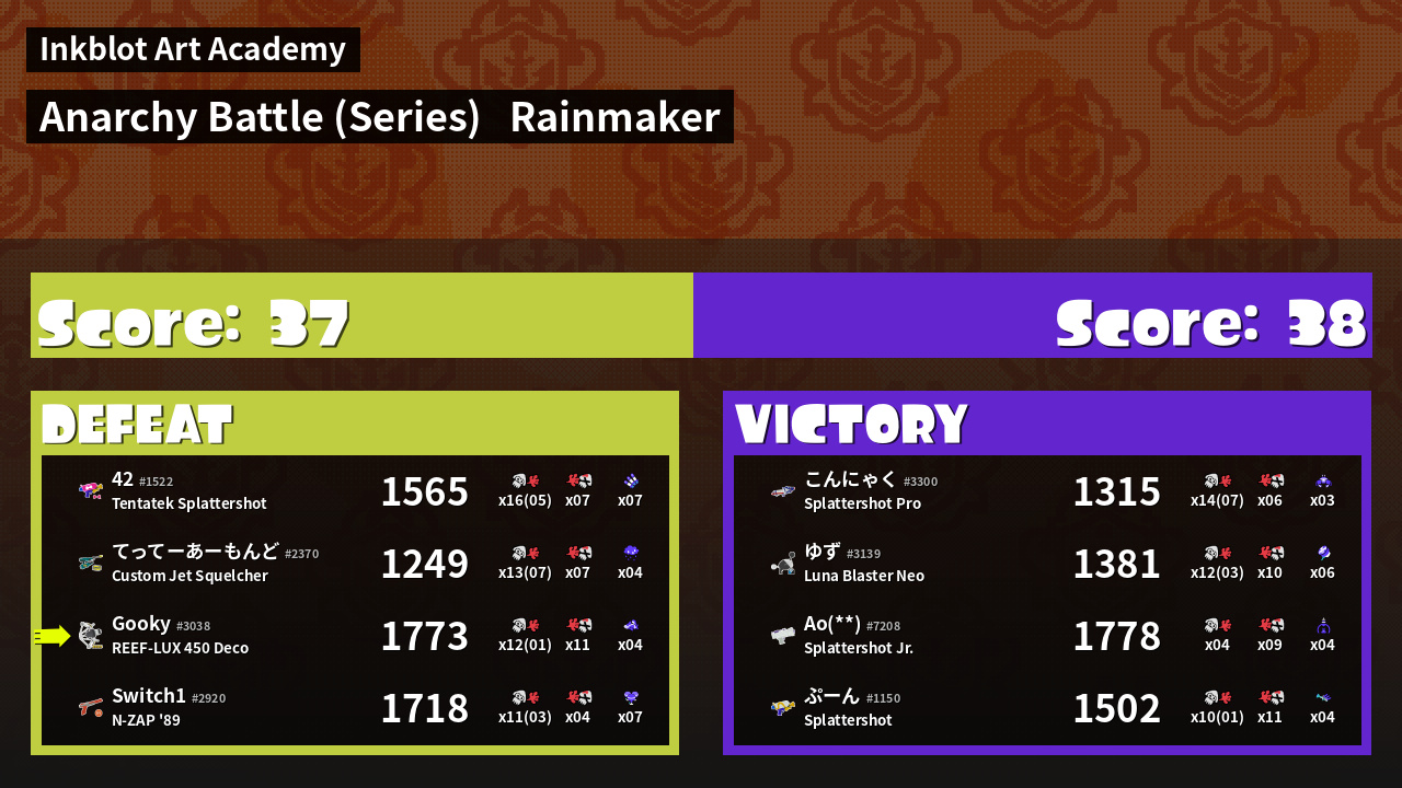 | Medals | #1 Turf Inker #1 Enemy Splatter #1 Rainmaker Stopper | ||
