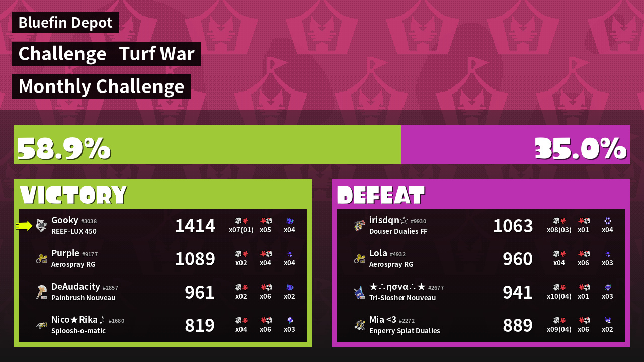 | Medals | #1 Overall Splatter #1 Turf Inker #1 Enemy-Base Inker | ||
