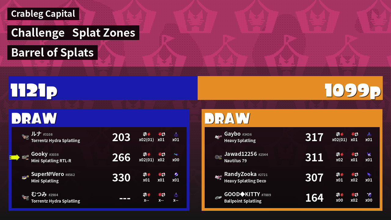 Challenge | Barrel of Splats Muster as much firepower as you can<br />in this battle of the splatlings! | ||