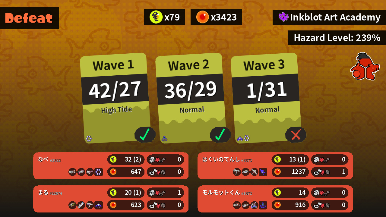 | Weapons | Blaster .52 Gal Heavy Splatling | Sploosh-o-matic Mint Decavitator Splat Roller | Range Blaster .96 Gal Slosher | Dynamo Roller Grizzco Brella Recycled Brella 24 Mk I |