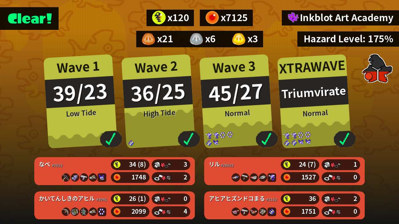 | Weapons | Undercover Brella Glooga Dualies Big Swig Roller Grizzco Blaster | Rapid Blaster Pro Splat Roller Hydra Splatling Grizzco Dualies | Tenta Brella Grizzco Slosher Wellstring V Grizzco Blaster | Splattershot Pro Carbon Roller Goo Tuber Grizzco Brella |
