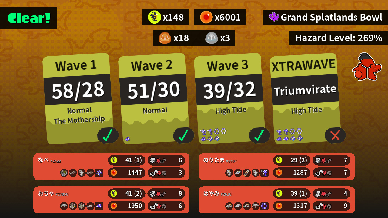 | Weapons | Grizzco Slosher Grizzco Charger Grizzco Stringer Grizzco Charger | Grizzco Roller Grizzco Dualies Grizzco Dualies Grizzco Charger | Grizzco Blaster Grizzco Brella Grizzco Blaster Grizzco Roller | Grizzco Stringer Grizzco Brella Grizzco Splatana Grizzco Stringer |