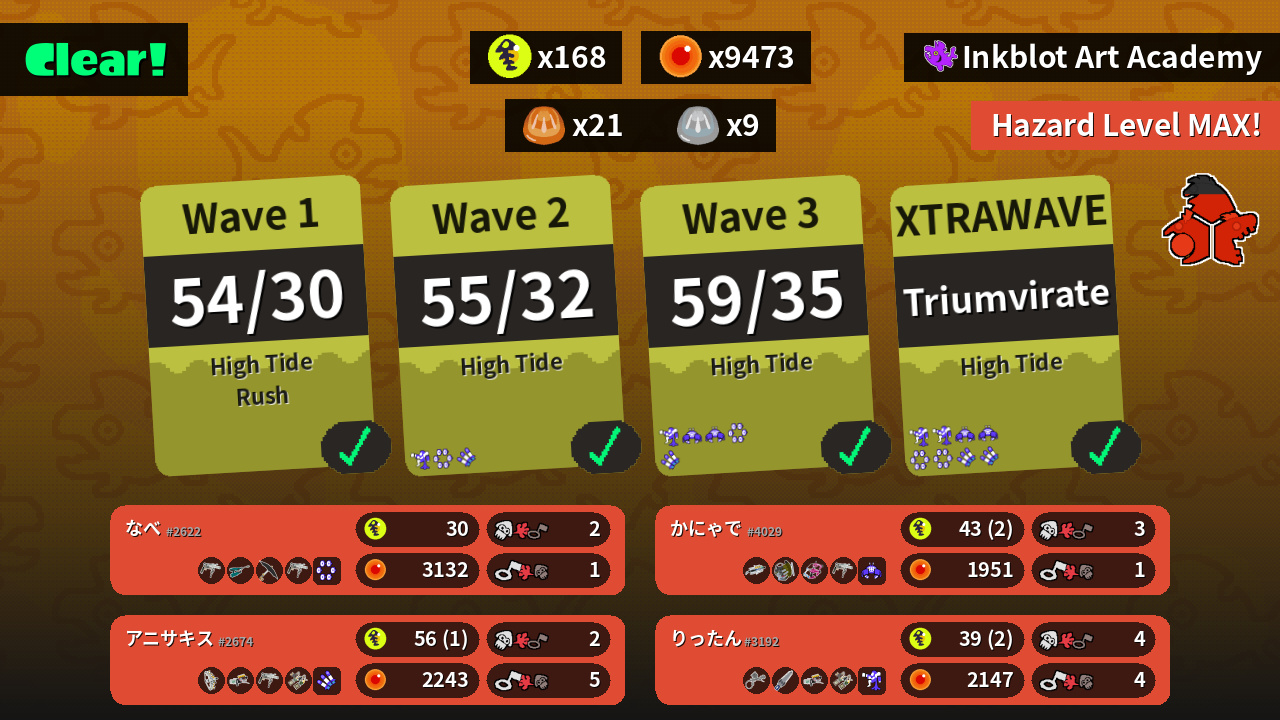 | Weapons | Grizzco Roller Jet Squelcher Undercover Brella Grizzco Roller | Grizzco Stringer Grizzco Blaster Grizzco Roller Grizzco Dualies | Grizzco Brella Grizzco Slosher Dapple Dualies Grizzco Roller | Aerospray MG Splatana Stamper Grizzco Blaster Grizzco Dualies |