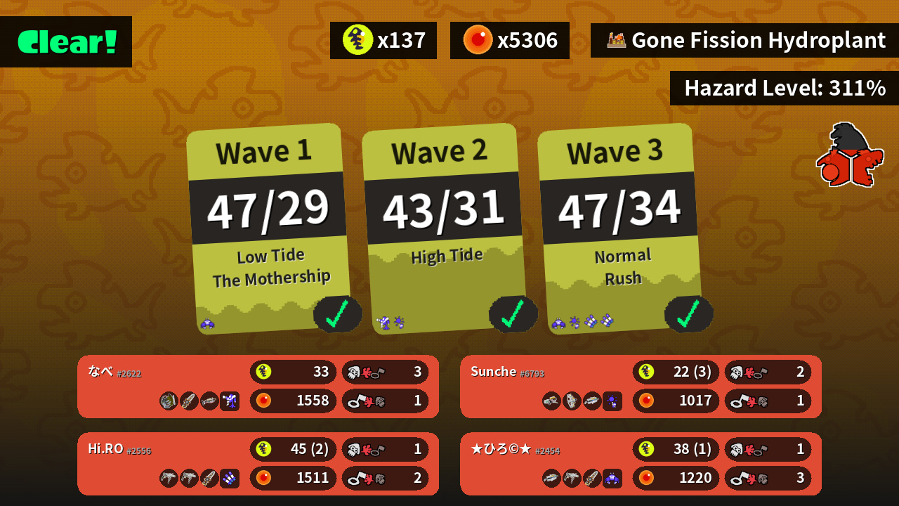 | Weapons | Grizzco Slosher Grizzco Splatana Grizzco Charger | Grizzco Roller Grizzco Roller Grizzco Splatana | Grizzco Brella Grizzco Roller Grizzco Splatana | Grizzco Blaster Grizzco Stringer Grizzco Brella |