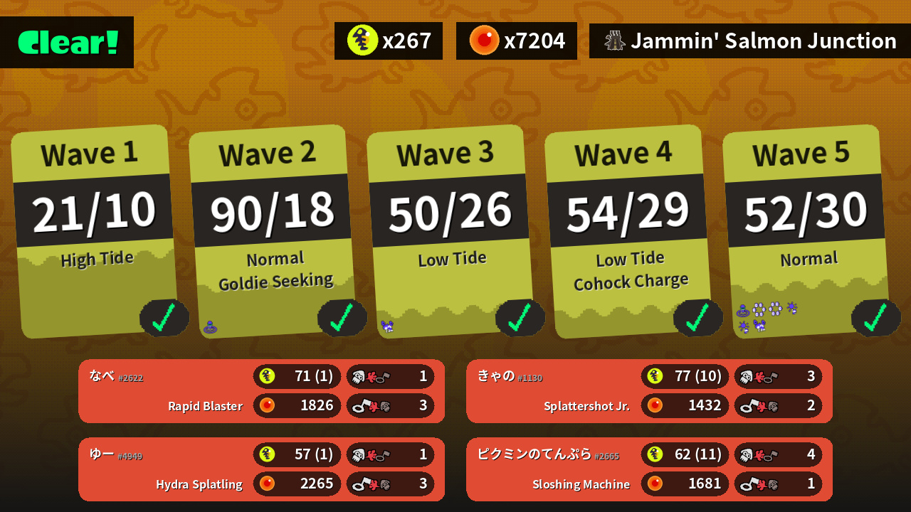 | Weapons | Rapid Blaster | Splattershot Jr. | Sloshing Machine | Hydra Splatling |