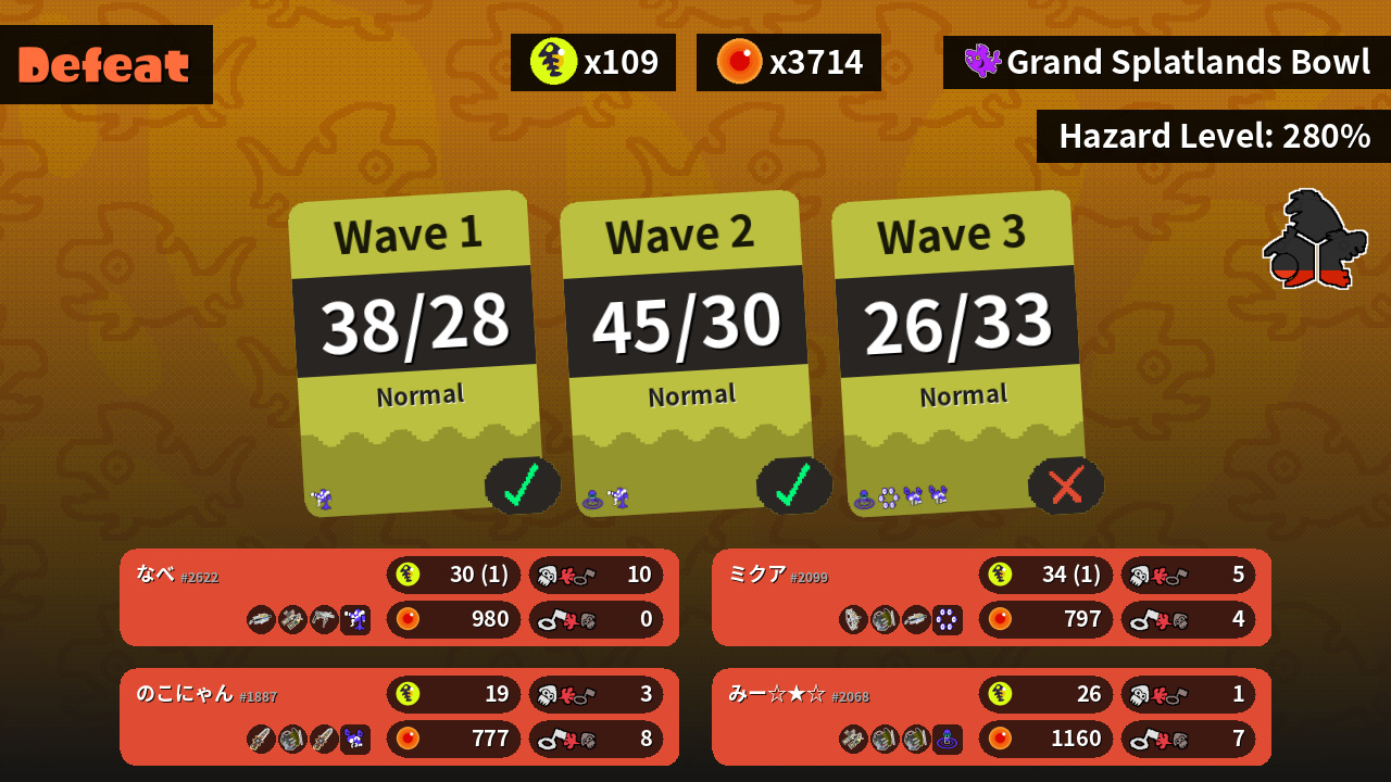 | Weapons | Grizzco Brella Grizzco Dualies Grizzco Roller | Grizzco Stringer Grizzco Slosher Grizzco Brella | Grizzco Dualies Grizzco Slosher Grizzco Slosher | Grizzco Splatana Grizzco Slosher Grizzco Splatana |
