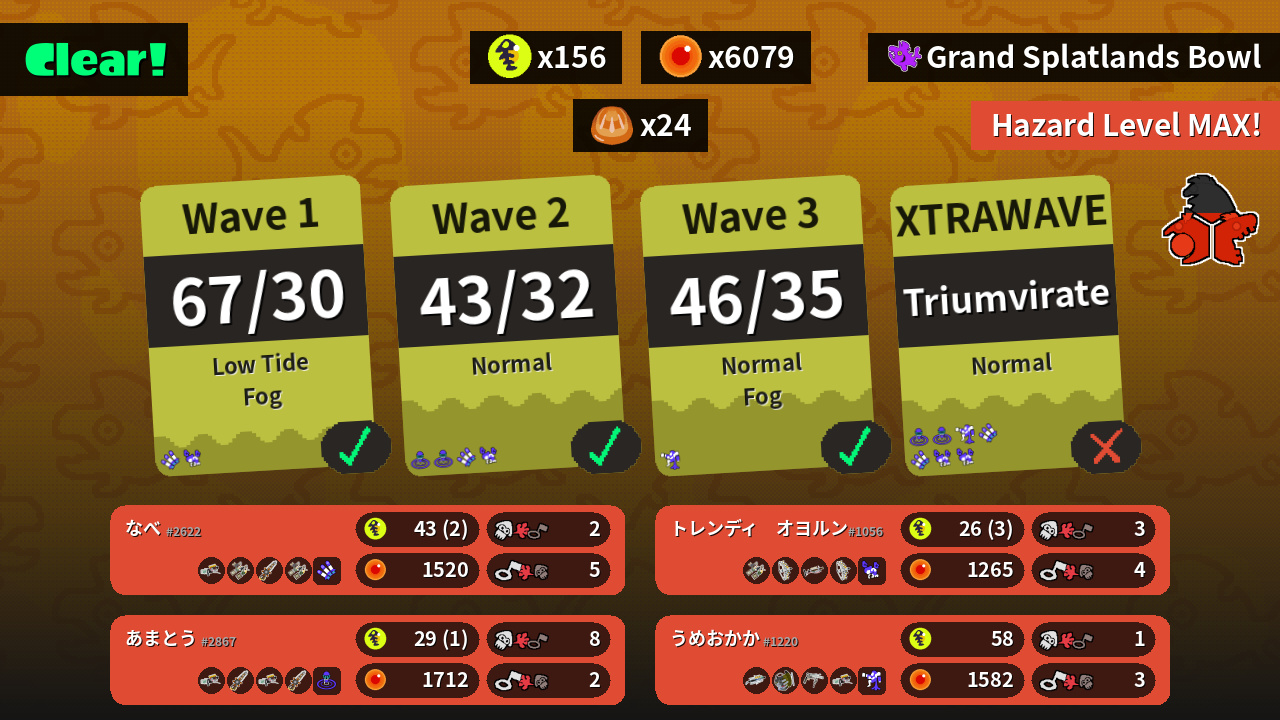 | Weapons | Grizzco Blaster Grizzco Dualies Grizzco Splatana Grizzco Dualies | Grizzco Brella Grizzco Slosher Grizzco Roller Grizzco Blaster | Grizzco Blaster Grizzco Splatana Grizzco Blaster Grizzco Splatana | Grizzco Dualies Grizzco Stringer Grizzco Charger Grizzco Stringer |