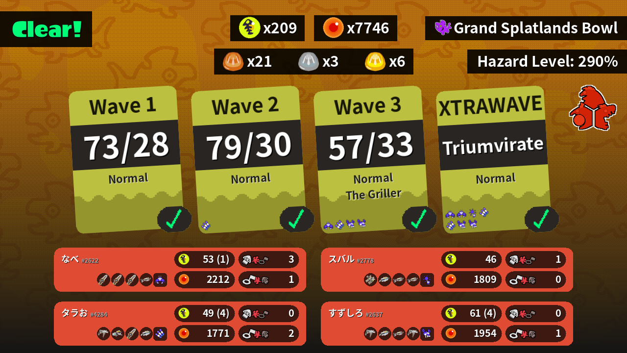 | Weapons | Grizzco Splatana Grizzco Splatana Grizzco Splatana Grizzco Charger | Grizzco Roller Grizzco Brella Grizzco Charger Grizzco Roller | Grizzco Roller Grizzco Blaster Grizzco Splatana Grizzco Brella | Grizzco Dualies Grizzco Brella Grizzco Charger Grizzco Charger |