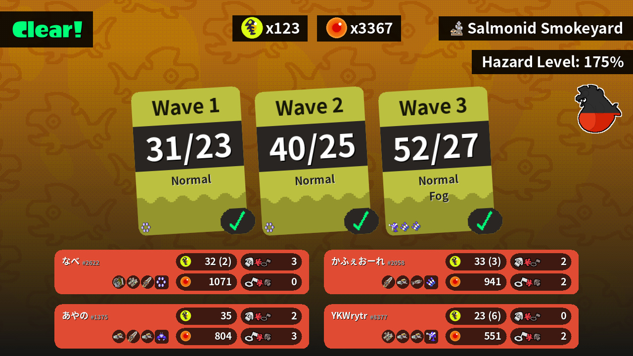 | Weapons | Grizzco Slosher Grizzco Dualies Grizzco Splatana | Grizzco Blaster Grizzco Splatana Grizzco Blaster | Grizzco Splatana Grizzco Blaster Grizzco Charger | Grizzco Dualies Grizzco Blaster Grizzco Blaster |