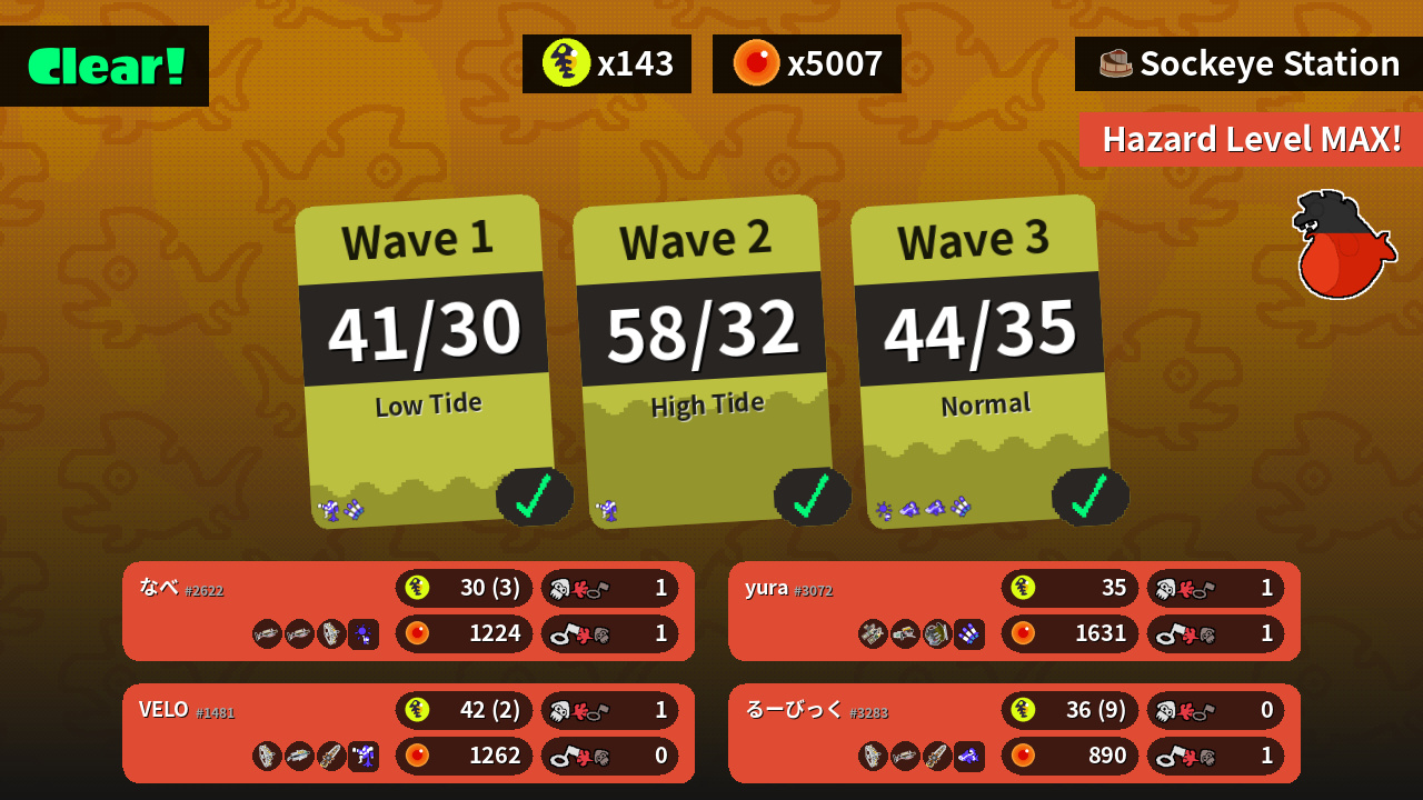 | Weapons | Grizzco Charger Grizzco Charger Grizzco Stringer | Grizzco Stringer Grizzco Brella Grizzco Splatana | Grizzco Stringer Grizzco Charger Grizzco Splatana | Grizzco Dualies Grizzco Blaster Grizzco Slosher |