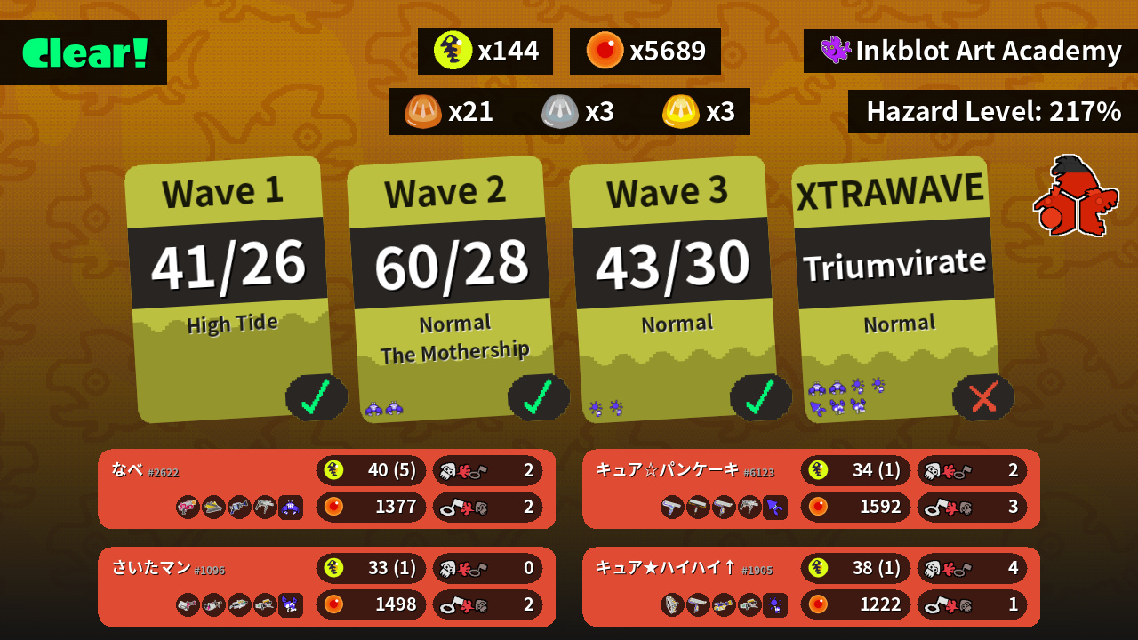 | Weapons | Rapid Blaster Dread Wringer H-3 Nozzlenose Grizzco Roller | Grizzco Stringer Splat Roller Mini Splatling Grizzco Blaster | Big Swig Roller Carbon Roller Splat Roller Grizzco Roller | Heavy Splatling .96 Gal Grizzco Brella Grizzco Blaster |