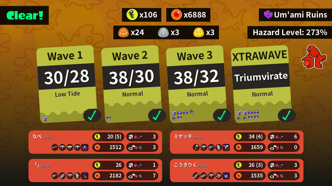 | Weapons | Bamboozler 14 Mk I Grizzco Roller Splattershot Grizzco Roller | Octobrush Grizzco Roller H-3 Nozzlenose Grizzco Stringer | H-3 Nozzlenose Dark Tetra Dualies Grizzco Roller Grizzco Stringer | Splatana Wiper S-BLAST '92 Grizzco Roller Grizzco Dualies |