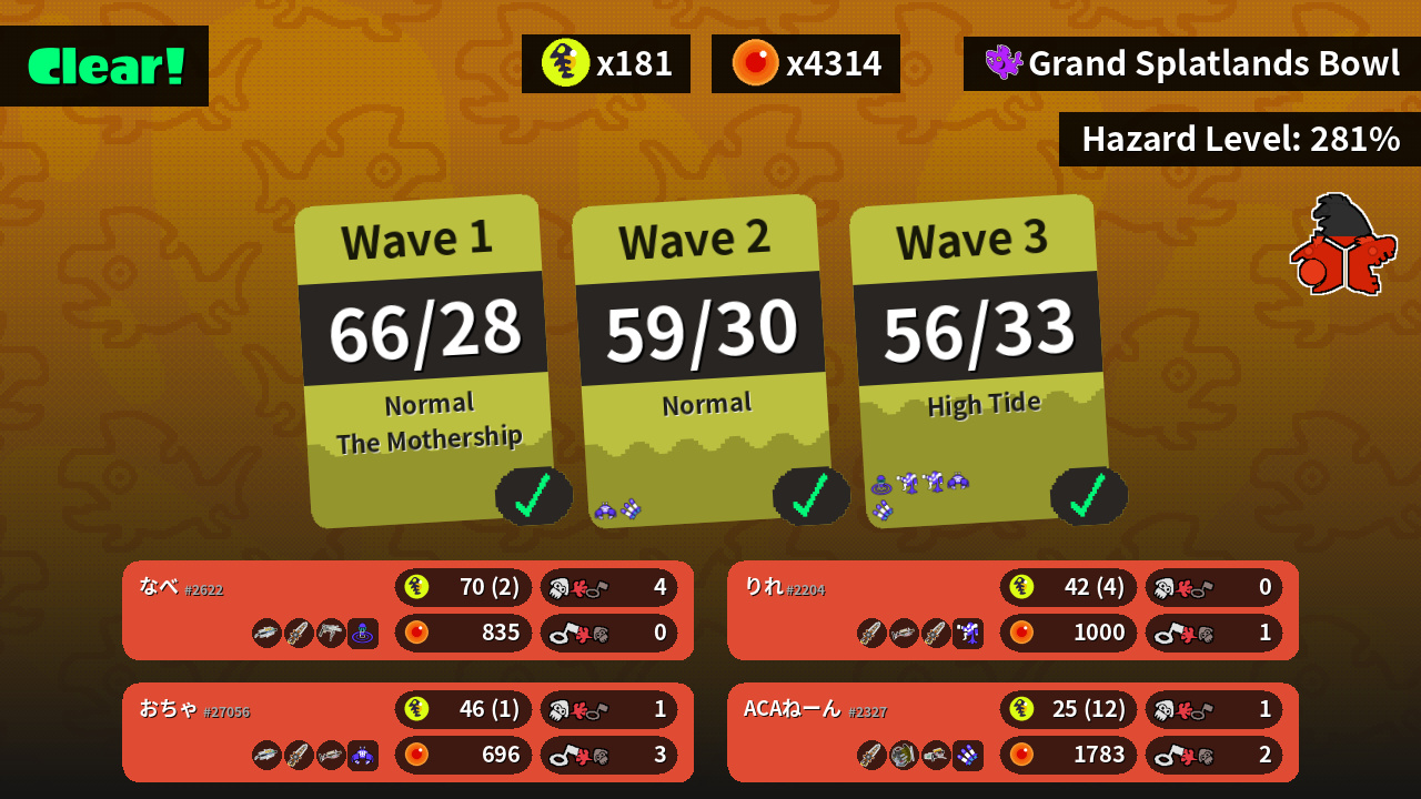 | Weapons | Grizzco Brella Grizzco Splatana Grizzco Roller | Grizzco Brella Grizzco Splatana Grizzco Charger | Grizzco Splatana Grizzco Charger Grizzco Splatana | Grizzco Splatana Grizzco Slosher Grizzco Blaster |
