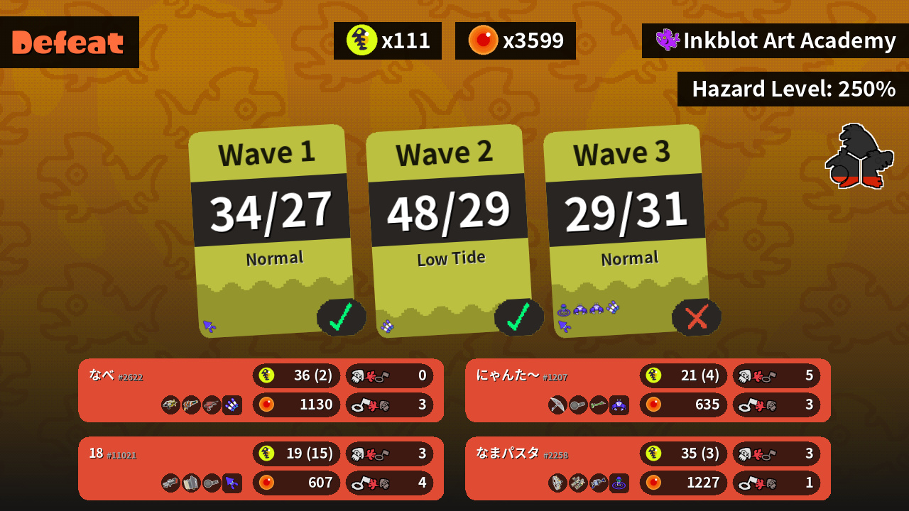 | Weapons | Splash-o-matic Squeezer Dualie Squelchers | Grizzco Stringer Grizzco Dualies H-3 Nozzlenose | Splat Brella Nautilus 47 Bamboozler 14 Mk I | S-BLAST '92 Sloshing Machine Nautilus 47 |