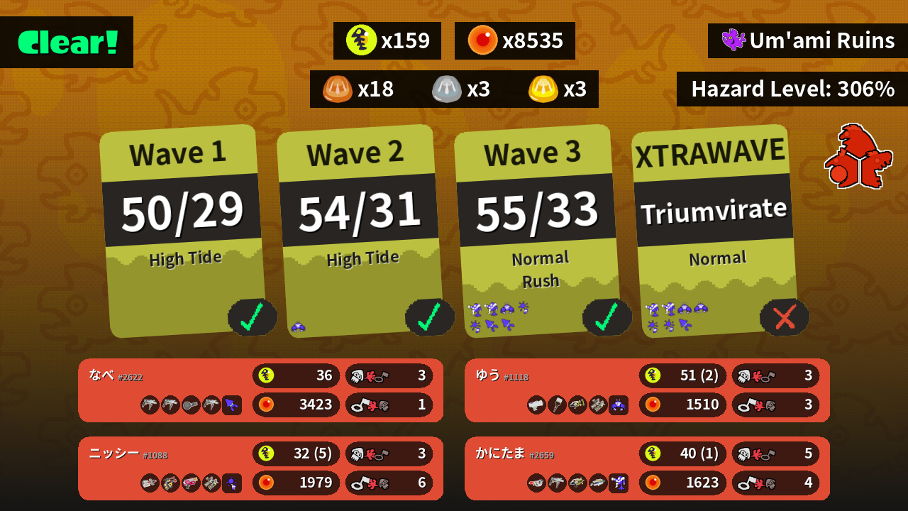 | Weapons | Grizzco Roller Grizzco Roller Nautilus 47 Grizzco Roller | Splattershot Jr. Octobrush Sploosh-o-matic Grizzco Dualies | Goo Tuber Grizzco Roller Splash-o-matic Grizzco Brella | Heavy Edit Splatling Douser Dualies FF Rapid Blaster Grizzco Dualies |