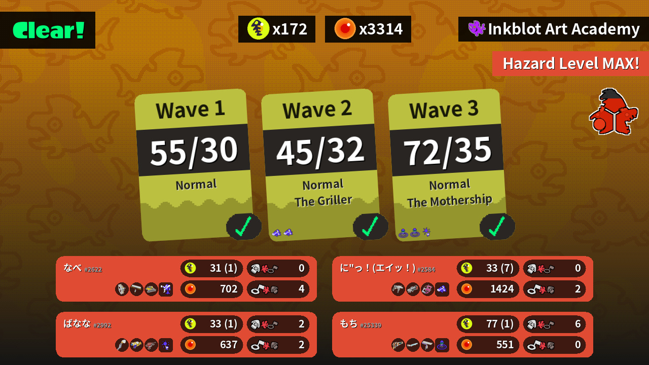 | Weapons | Grizzco Stringer Carbon Roller Dread Wringer | Squeezer Classic Squiffer Splat Roller | Grizzco Roller S-BLAST '92 Dapple Dualies | Inkbrush Splattershot Dualie Squelchers |