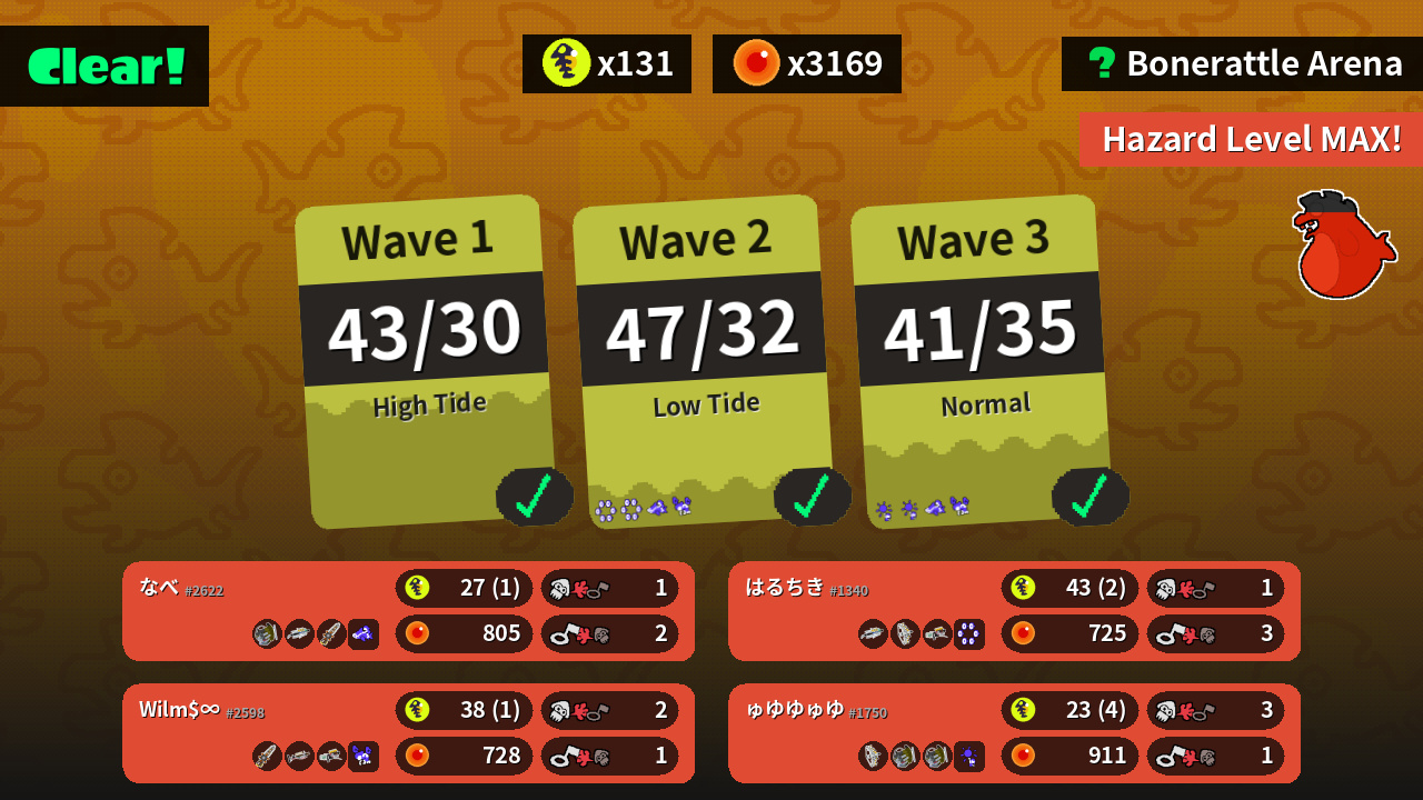 | Weapons | Grizzco Slosher Grizzco Brella Grizzco Splatana | Grizzco Brella Grizzco Stringer Grizzco Blaster | Grizzco Splatana Grizzco Charger Grizzco Blaster | Grizzco Stringer Grizzco Slosher Grizzco Slosher |