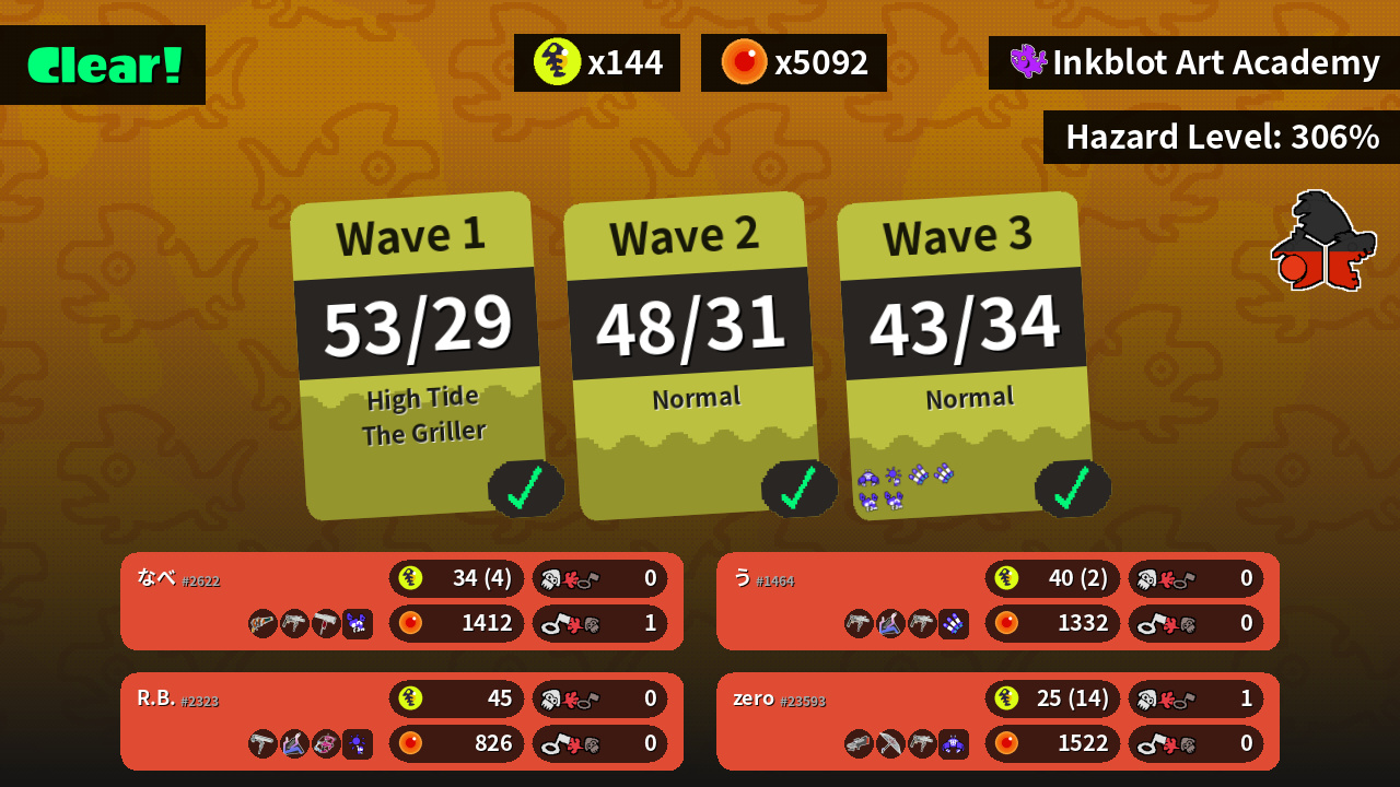 | Weapons | Squeezer Grizzco Roller Flingza Roller | Dynamo Roller Slosher Dapple Dualies | Grizzco Roller Slosher Grizzco Roller | S-BLAST '92 Splat Brella Grizzco Roller |