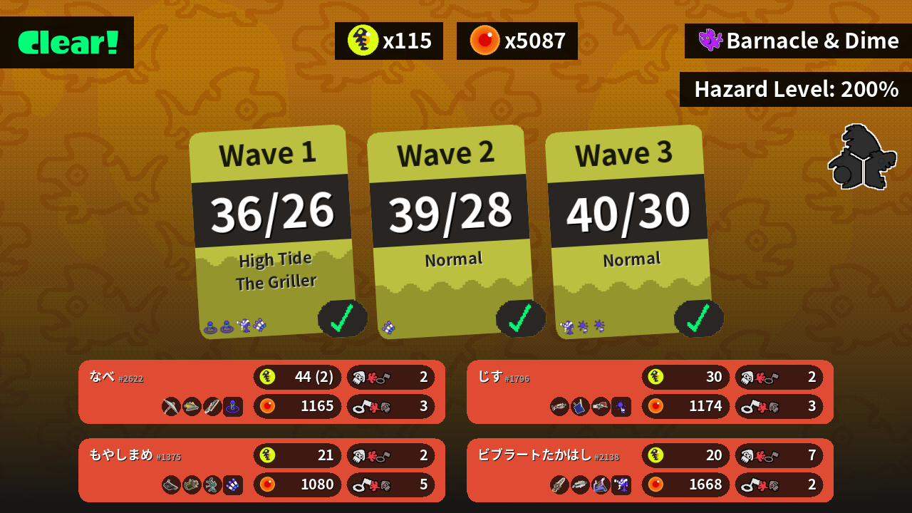 | Weapons | Recycled Brella 24 Mk I Dread Wringer Splatana Wiper | Grizzco Charger Tri-Slosher Range Blaster | Bloblobber Explosher Wellstring V | Grizzco Splatana Grizzco Brella Slosher |