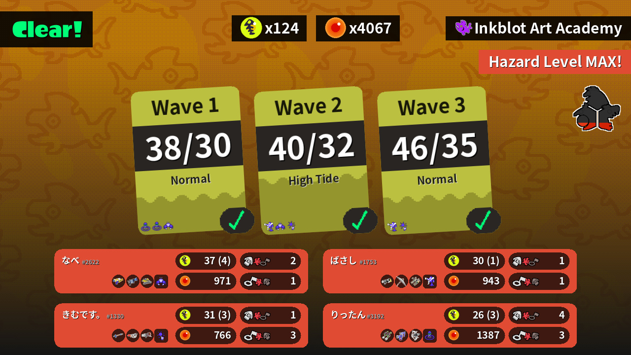 | Weapons | Splattershot L-3 Nozzlenose Dread Wringer | Snipewriter 5H Goo Tuber Blaster | Splattershot Nova Recycled Brella 24 Mk I Grizzco Dualies | Splat Dualies Glooga Dualies REEF-LUX 450 |