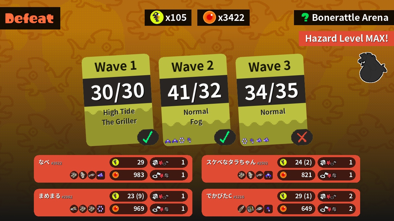 | Weapons | Grizzco Dualies Grizzco Stringer Grizzco Charger | Grizzco Splatana Grizzco Slosher Grizzco Brella | Grizzco Dualies Grizzco Stringer Grizzco Charger | Grizzco Blaster Grizzco Dualies Grizzco Dualies |