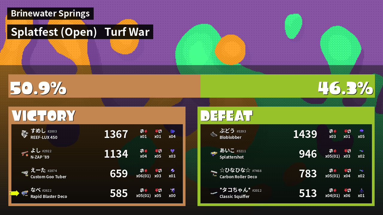 | Medals | #1 Splat Assister #1 Damage Taker #1 Ink Consumer | ||