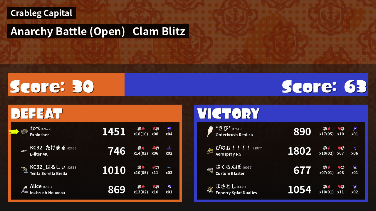 | Mode | Clam Blitz - Anarchy Battle (Open) | ||