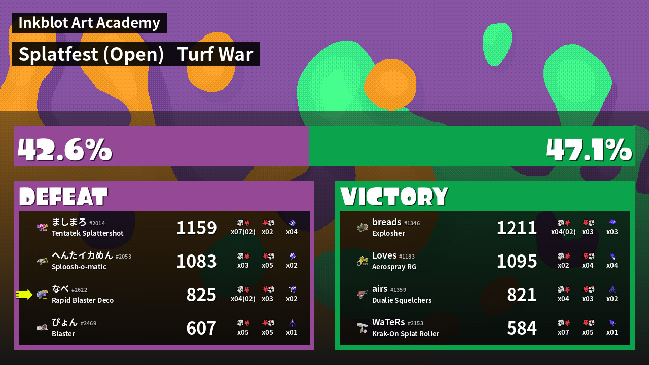 | Medals | #1 Popular Target #1 Enemy-Base Inker #1 Splat Assister | ||