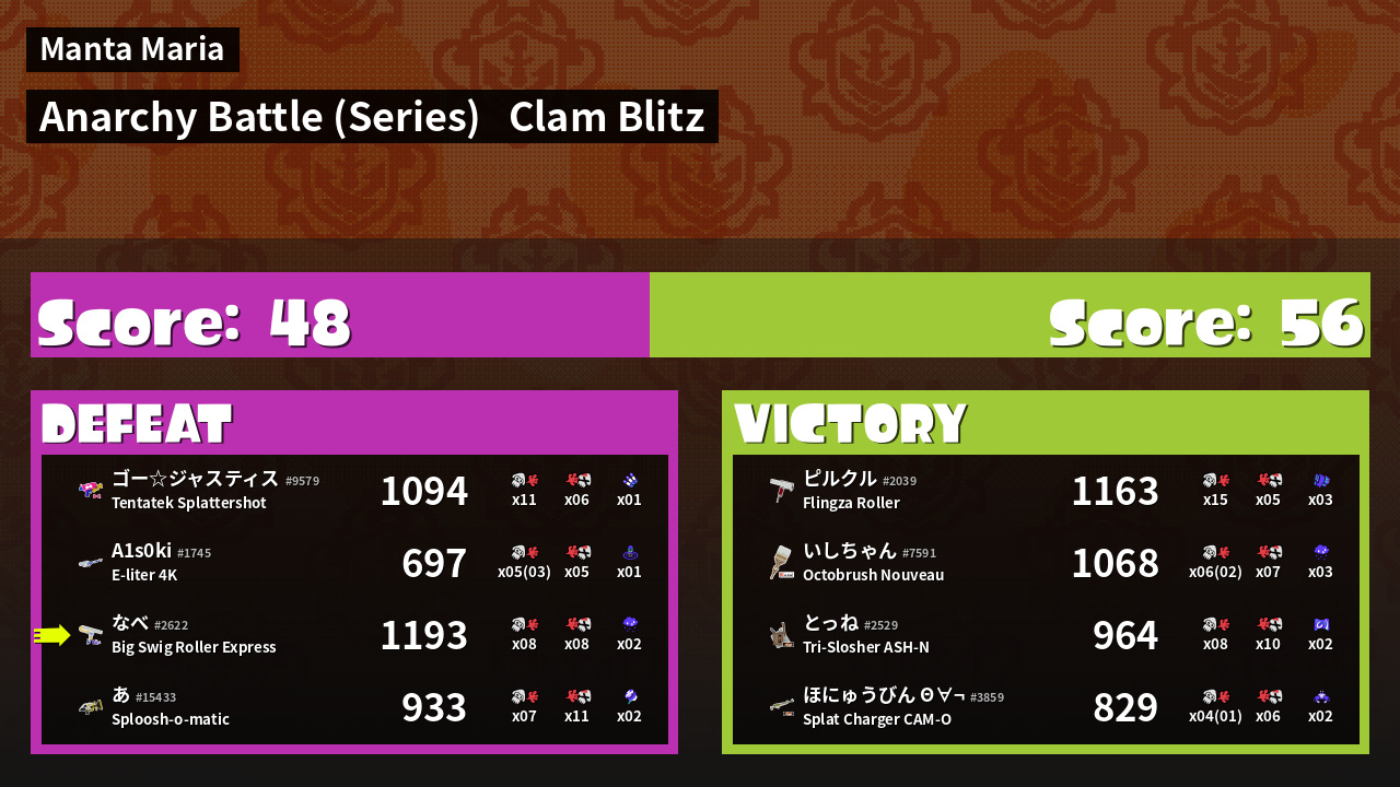| Weapon | Big Swig Roller Express ( Angle Shooter / Ink Storm) |
