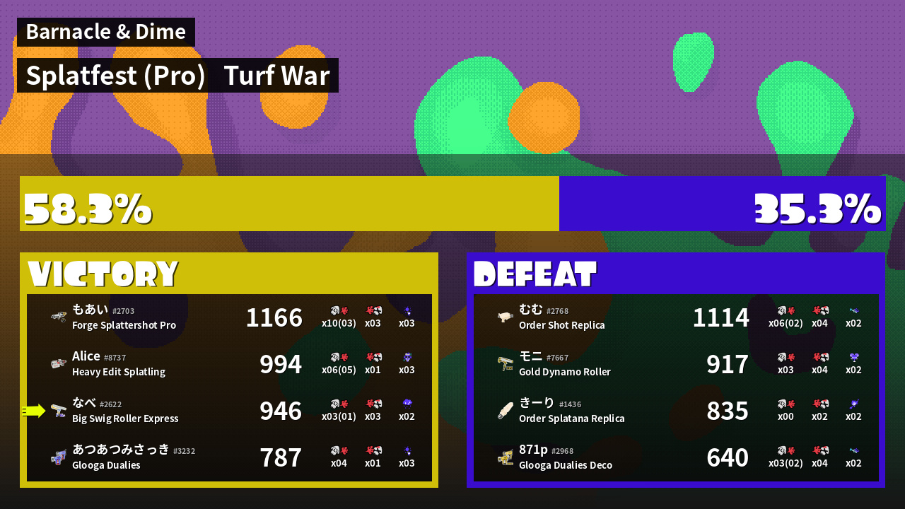 | Weapon | Big Swig Roller Express ( Angle Shooter / Ink Storm) | ||