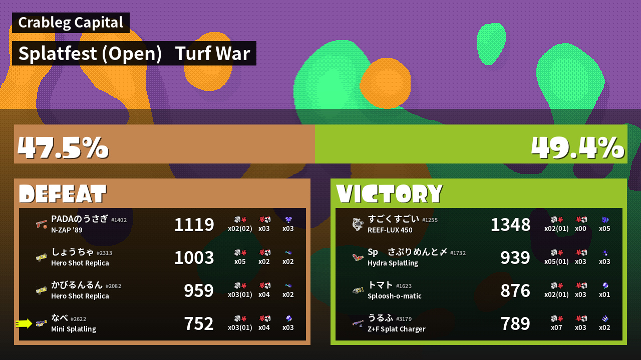 | Medals | #1 Enemy-Base Inker #2 Overall Splatter #2 Enemy Splatter | ||