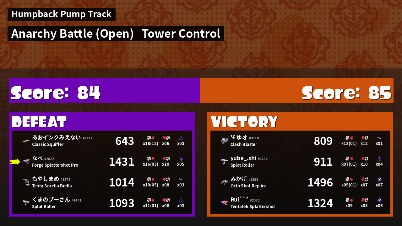 | Medals | #1 Turf Inker #1 Enemy Splatter #1 Checkpoint Breaker | ||