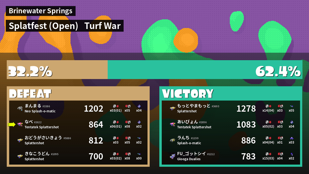 | Medals | #1 Overall Splatter #1 Enemy Splatter #1 Ink Consumer | ||
