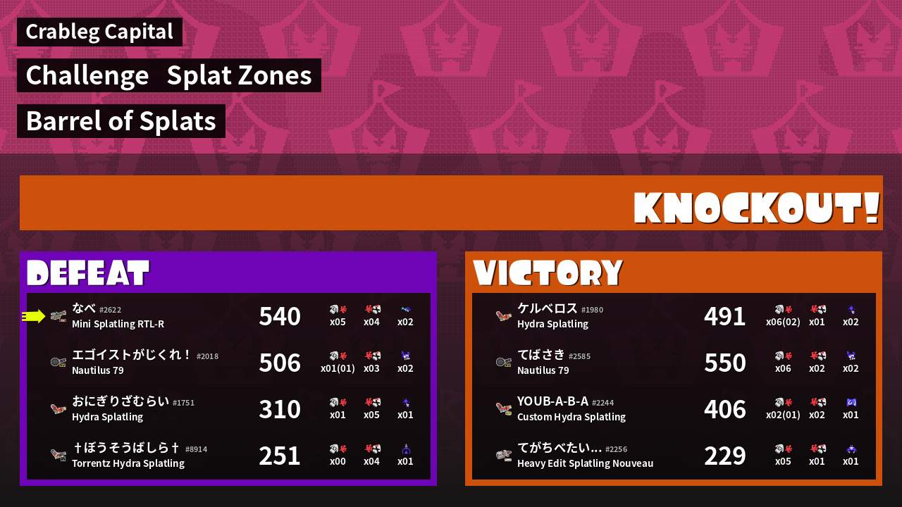 | Challenge | Barrel of Splats Muster as much firepower as you can<br />in this battle of the splatlings! | ||
