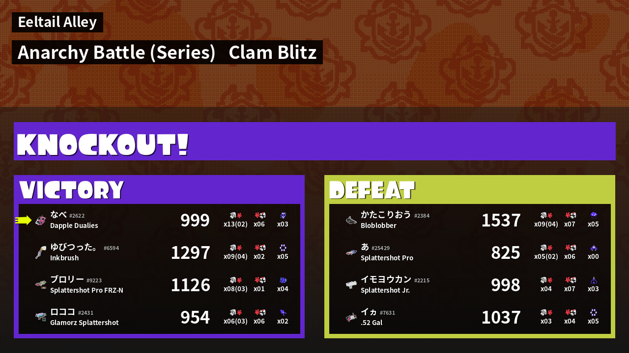 | Medals | #1 Overall Splatter #1 Score Booster #1 Clam Carrier |