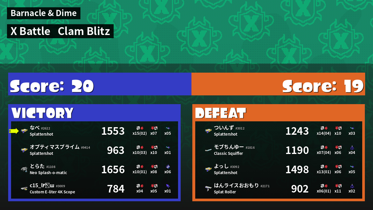 | Mode | Clam Blitz - X Battle | ||