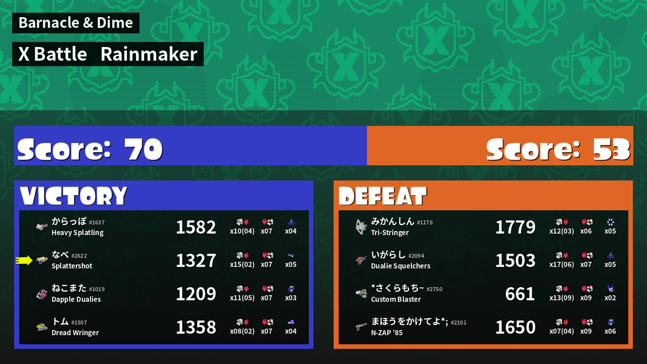 | Medals | #1 Overall Splatter #1 Enemy Splatter #1 Ink Consumer | ||