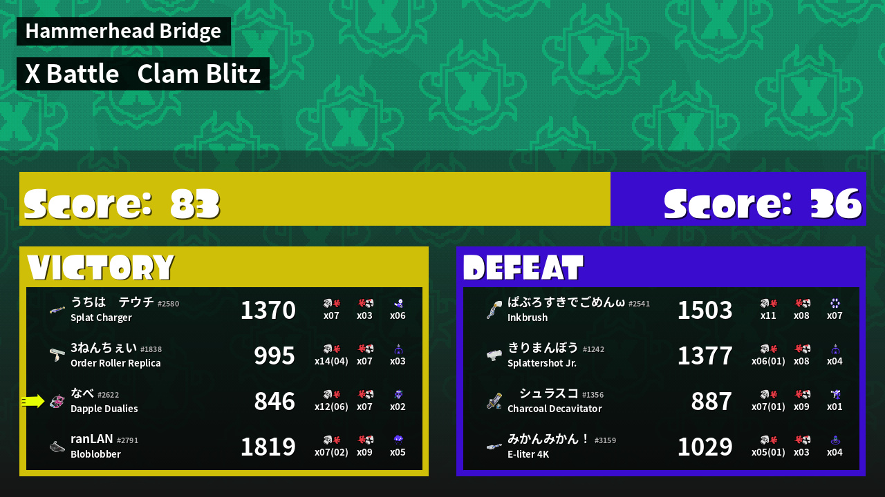 | Medals | #1 Super Jump Spot #1 Splat Assister #1 Clam Stopper | ||