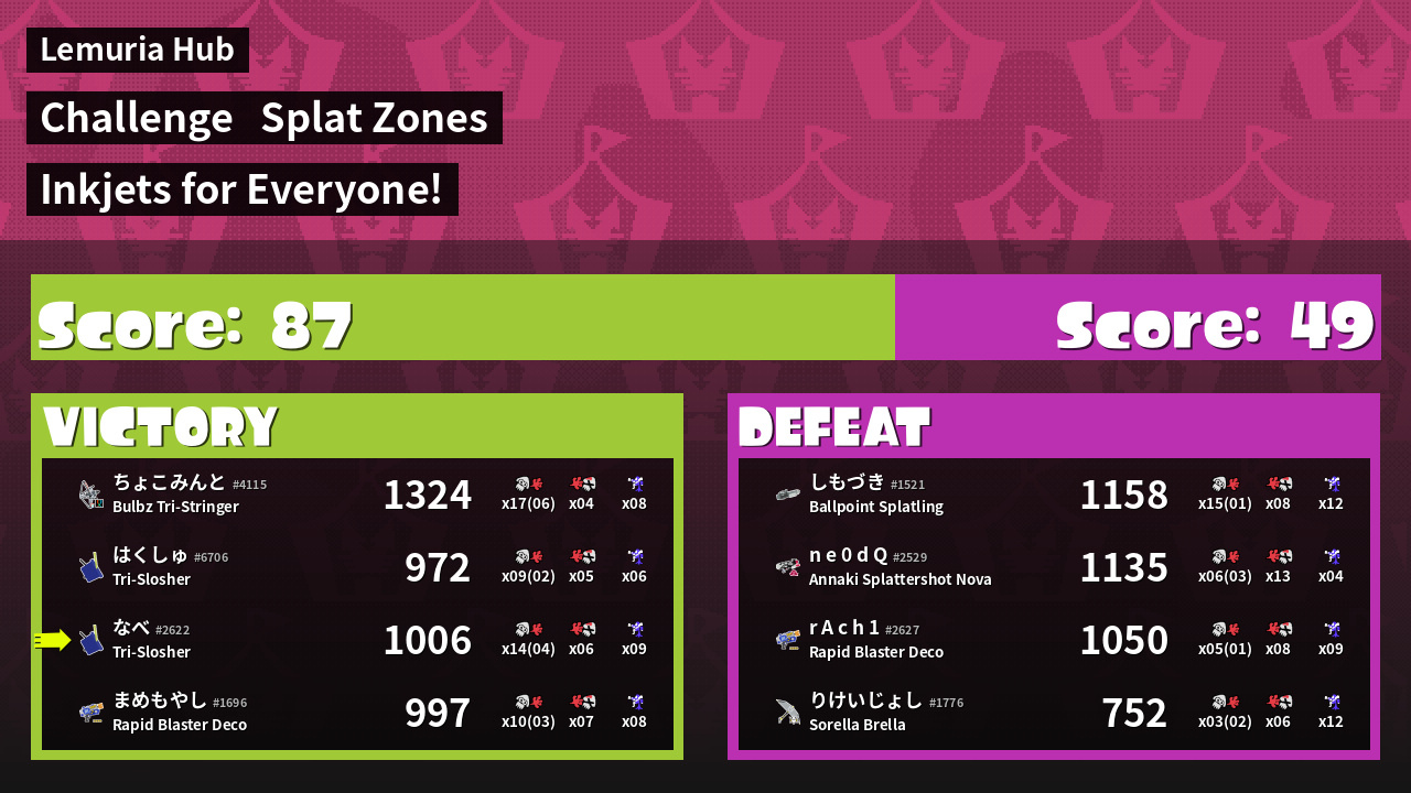 | Medals | #1 Super Jump Spot #1 Splat Zone Hero #1 Ground Traveler |