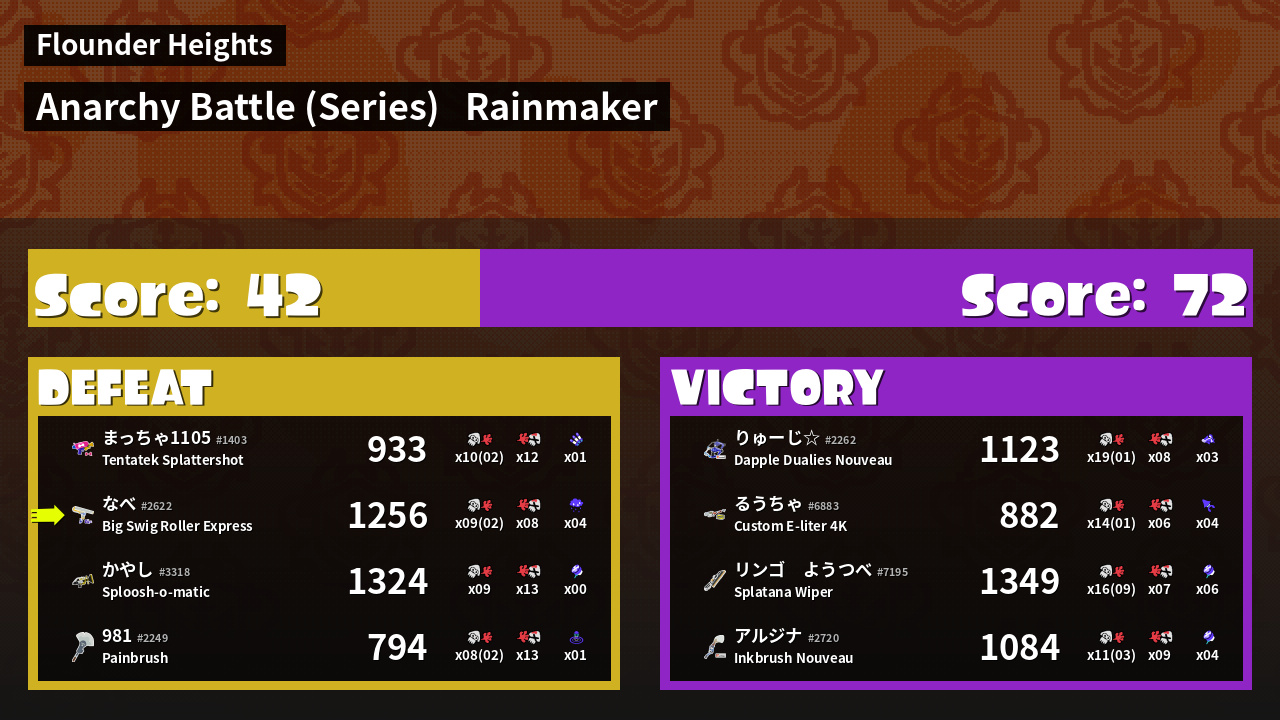 | Weapon | Big Swig Roller Express ( Angle Shooter / Ink Storm) | ||