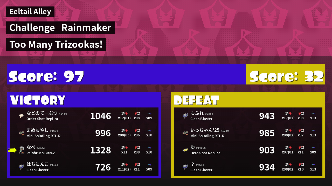 | Medals | #1 Turf Inker #1 Enemy Splatter #2 Overall Splatter | ||