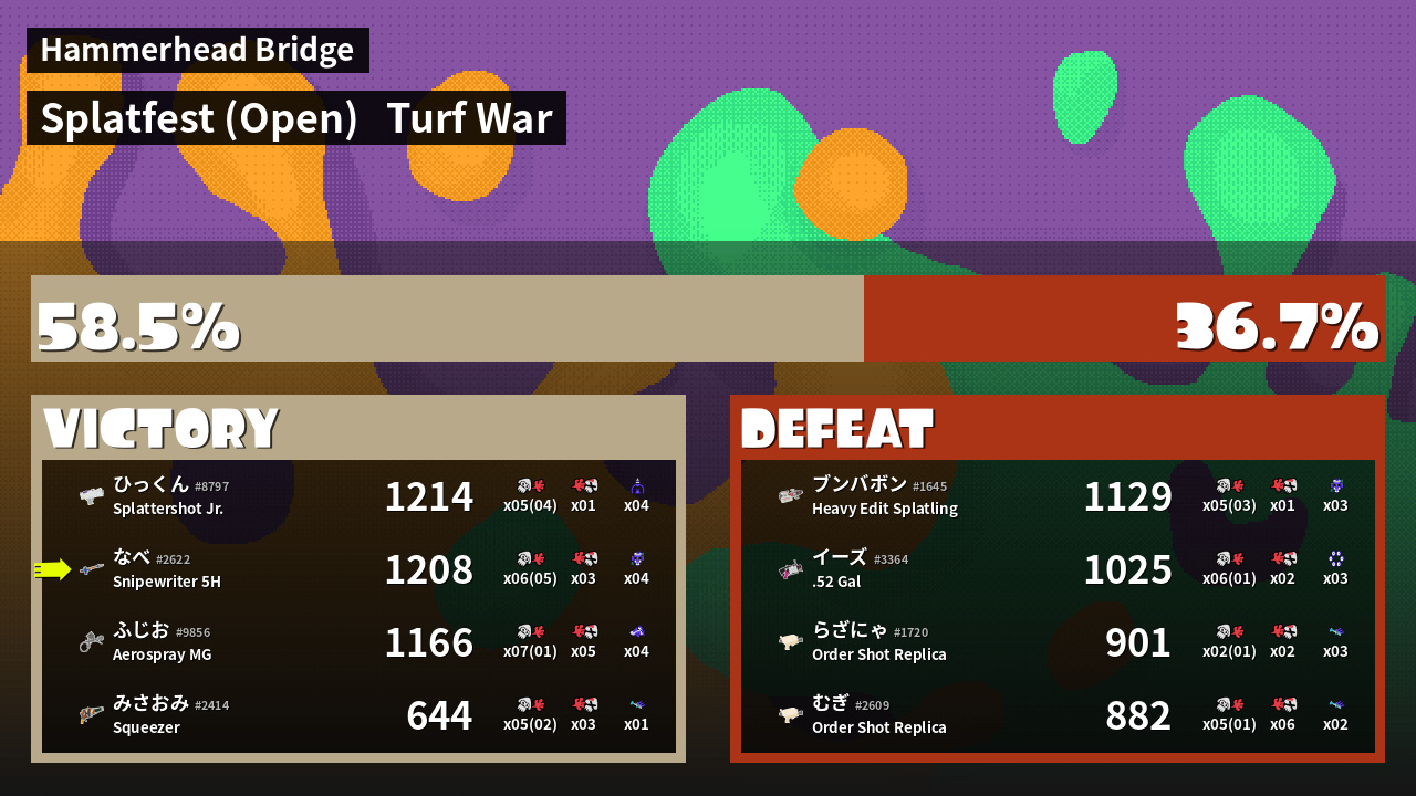 | Medals | #1 Splat Assister #1 Tacticooler User #2 Overall Splatter | ||