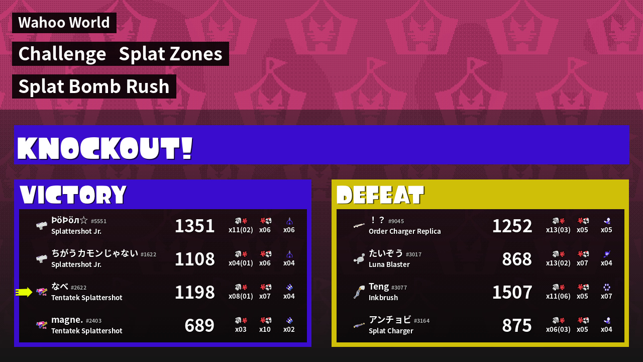 | Challenge | Splat Bomb Rush Let the Splat Bombs fly in this free-for-all! | ||