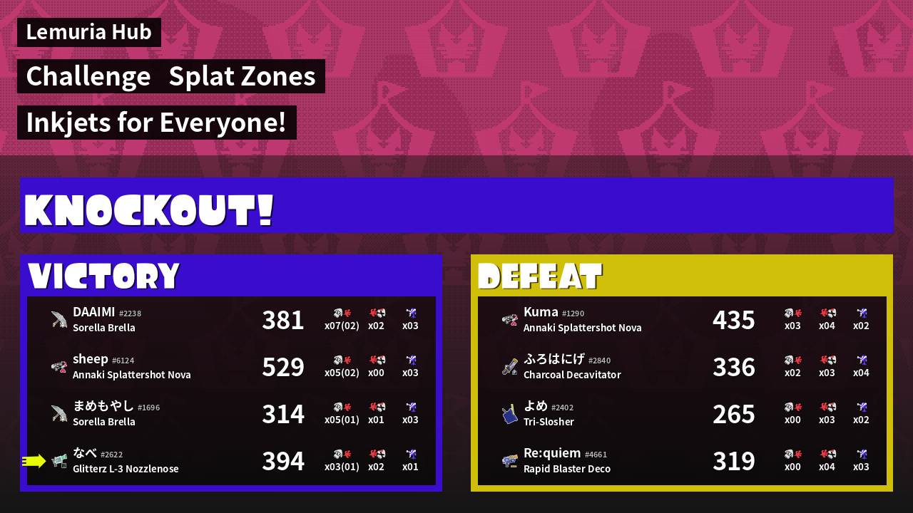 | Weapon | Glitterz L-3 Nozzlenose ( Splat Bomb / Inkjet) |