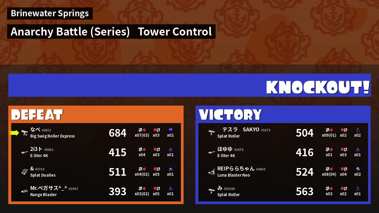 | Medals | #1 Overall Splatter #1 Turf Inker #1 Enemy Splatter | ||