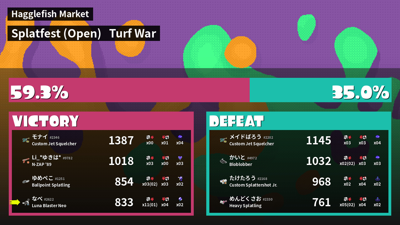 | Medals | #1 Overall Splatter #1 Enemy-Base Inker #1 Enemy Splatter | ||