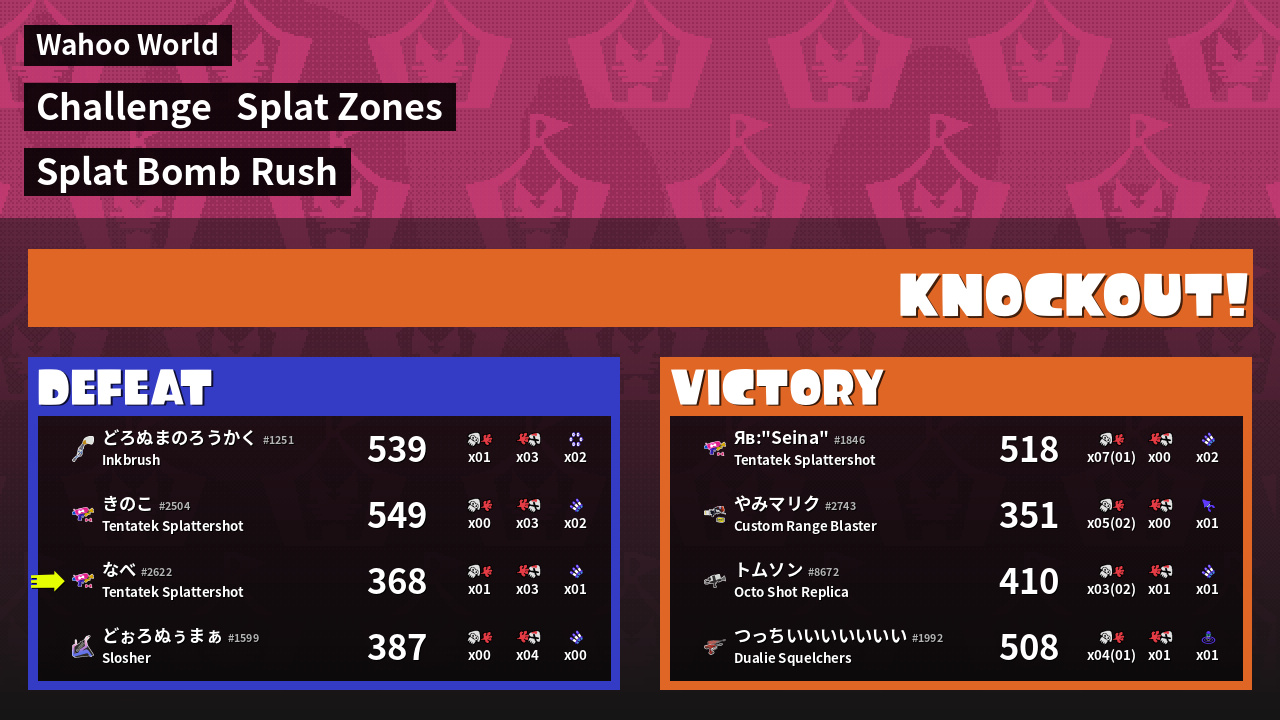 | Challenge | Splat Bomb Rush Let the Splat Bombs fly in this free-for-all! | ||